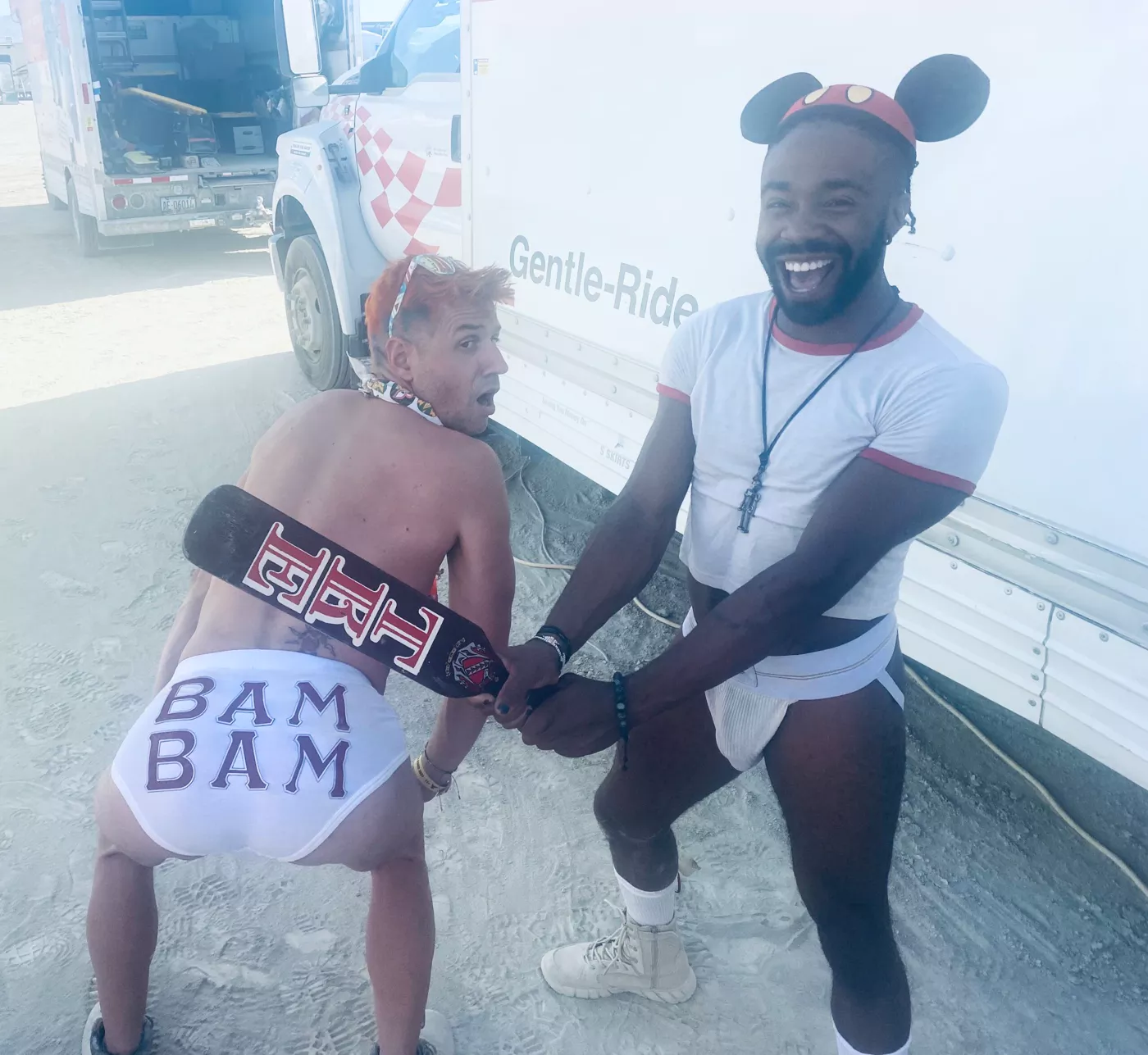 Strip down and grease up to compete in the slickest sport on Playa for Naked Oil Wrestling Monday, Wednesday, and Friday afternoons. Camp Gymnasium’s philosophy posits that by competing in activities naked participants will experience a heightened level of bonding. Think nudity meets community!