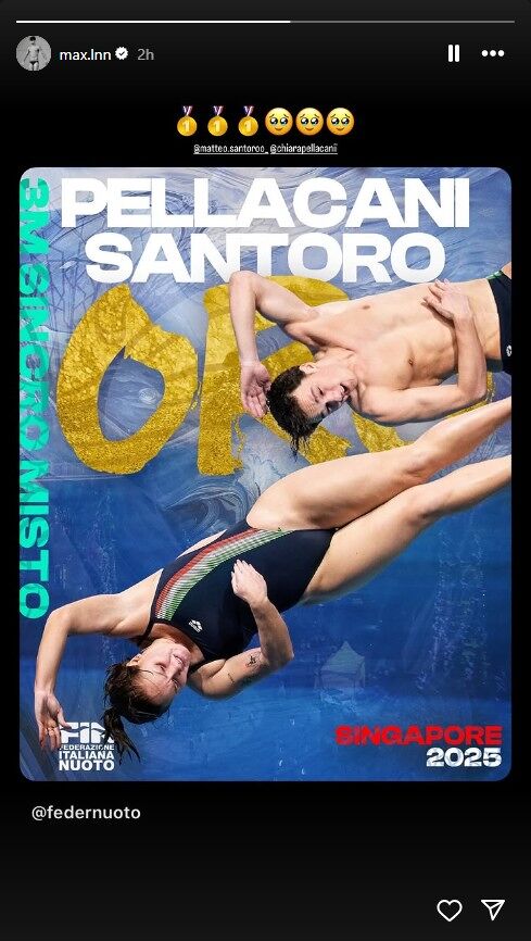 “I’m so happy,” he said. “With Chiara, I can remain calm. I did breathing exercises, distracting myself. Tomorrow I have the 3-meter individual. I’m celebrating, but I’ll have to reset immediately.”