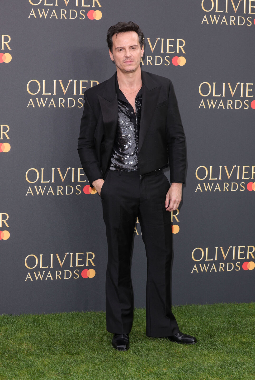 Scott’s cropped jacket, glittery shirt, and flare slacks were a winner at the Olivier Awards in London.