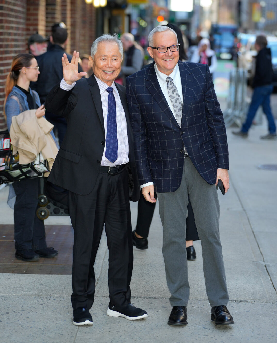 The husbands looked dapper as they arrived to the Ed Sullivan Theatre in NYC as the Star Trek legend flashed the Vulcan salute.