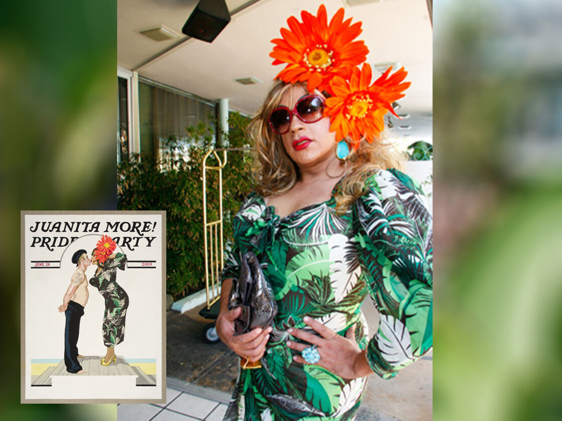2009 – The JM! Pride poster, designed by artist Matthew Benedict, reflected the dress worn by Juanita MORE! at the 2009 party.