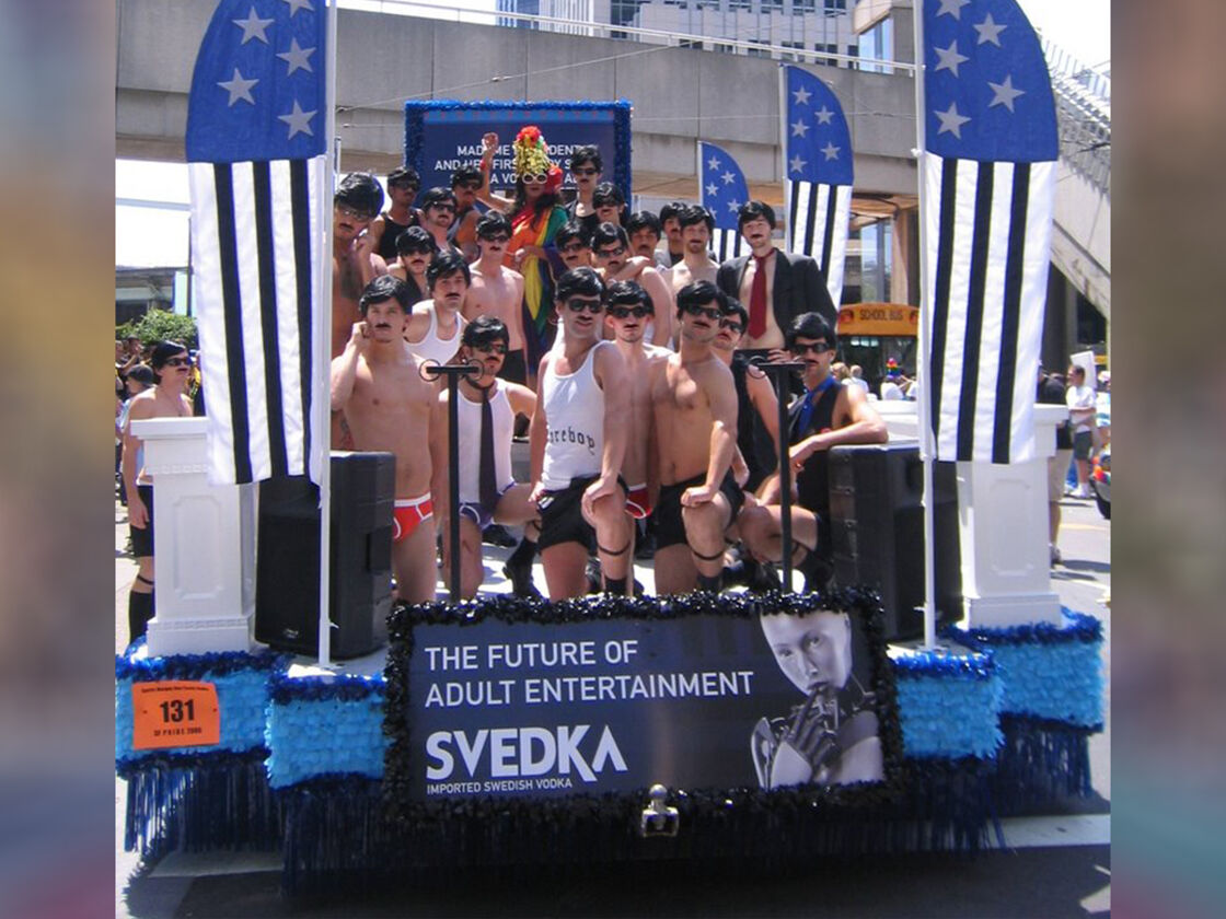 2003 – The MOREboys pose on a Svedka Vodka float as Secret Service agents to Juanita’s rainbow president.