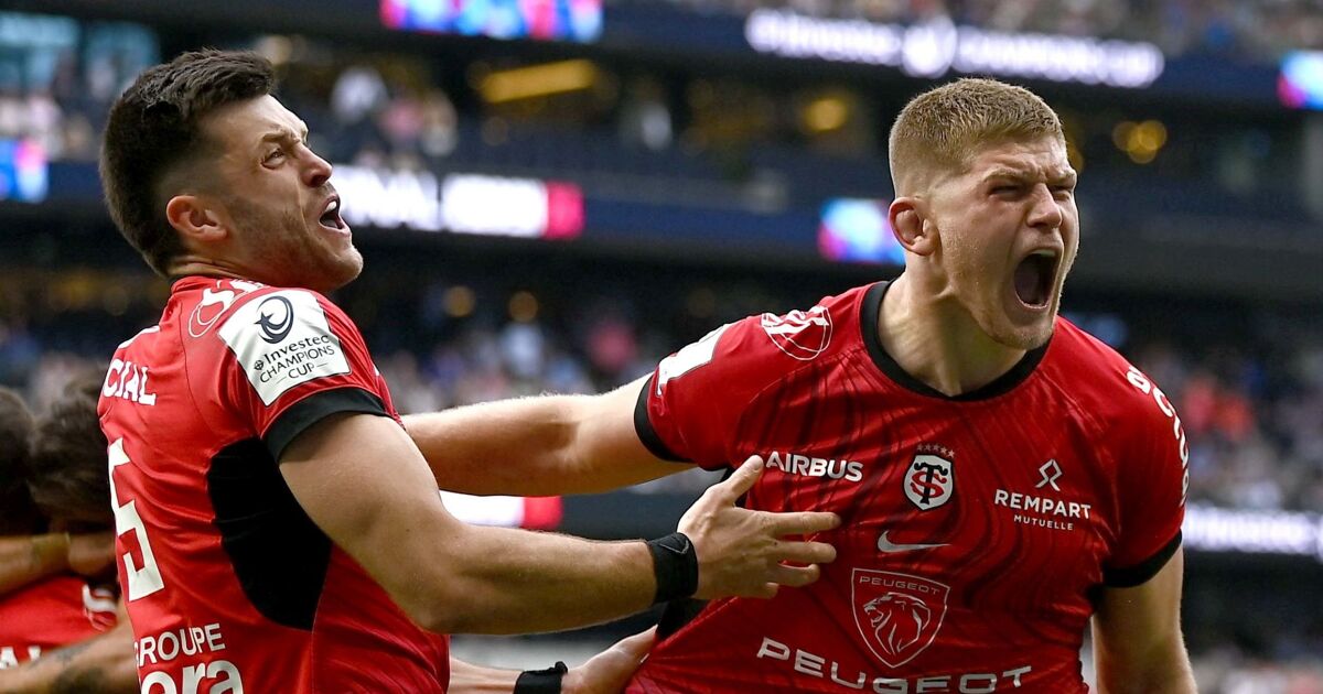 Also posted by the pro league’s official accounts, the lighthearted moment shows Toulouse stars Jack Willis and Blair Kinghorn celebrating their victory with a kiss.