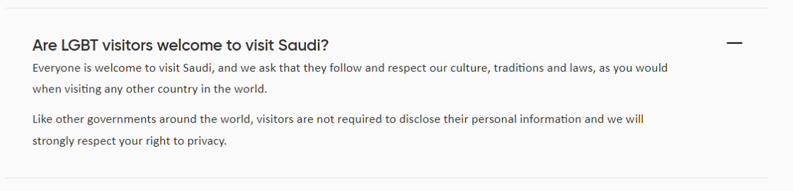 Since last year, the Visit Saudi website has included the question “Are LGBT visitors welcome to visit Saudi?” among its FAQs. “Everyone is welcome,” reads the guidance. “We will strongly respect your right to privacy.”