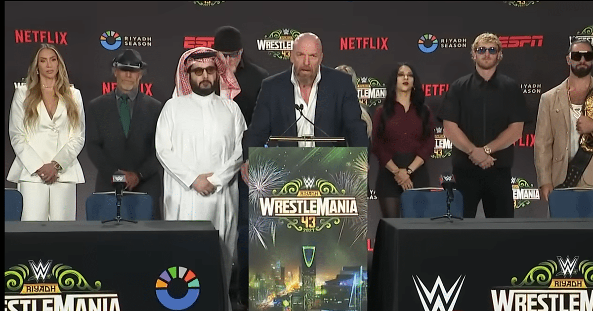 WWE CCO Paul Levesque and General Entertainment Authority chairman Turki Alalshikh stood at the podium as the announcement was made: WrestleMania will be held in Riyadh, Saudi Arabia, in 2027.